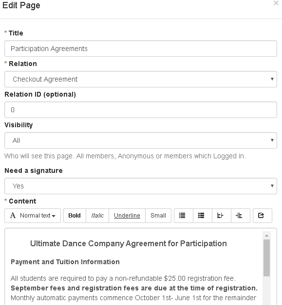 To create a new signed agreement, go to your DSM Admin and Click Settings > Pages. There you can create a new agreement, and you can choose where the button to request e-signature will be displayed, including the homepage of the online client, the parent registration page, student registration page, or checkout page. You can see below where “Need a Signature” is set to “yes”.