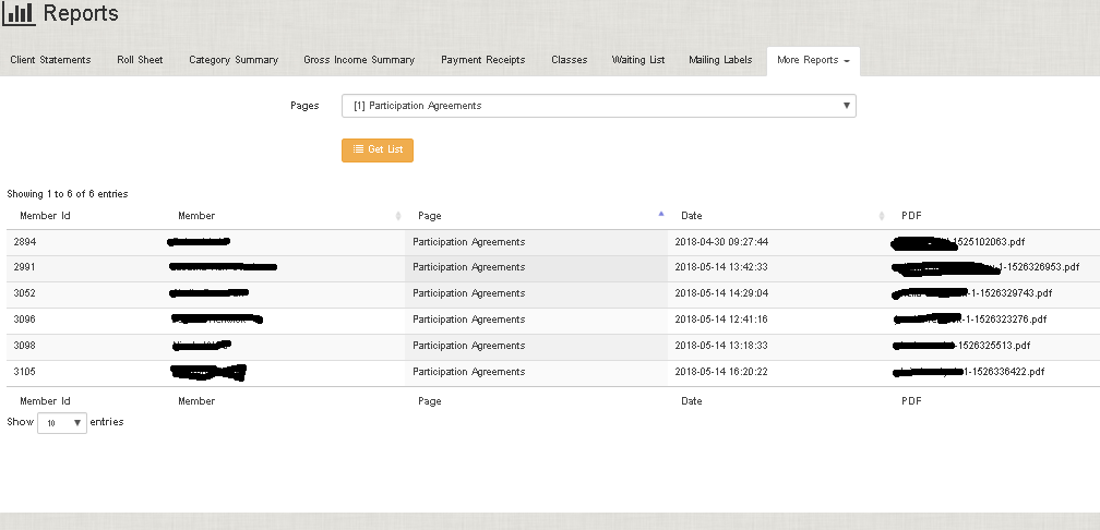 Also, the administrator can see all agreements that have been signed. In the DSM admin, go to Reports > Signed Waivers. Note, that you can download the PDF with the signed document and print it should the need arise.