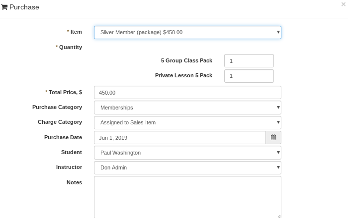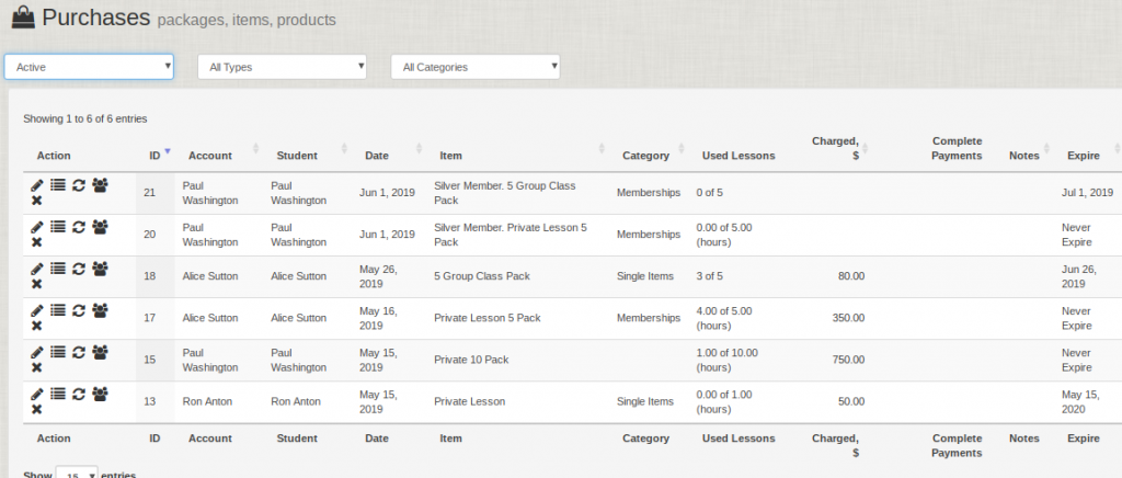 We will see the purchase made by Paul Washington in the above example. It is split into two rows, one for the group classes, and one for the private lessons. Once payments are tendered, we will start to see information about the completed payments. And as lessons are used, of course this information will be updated too.