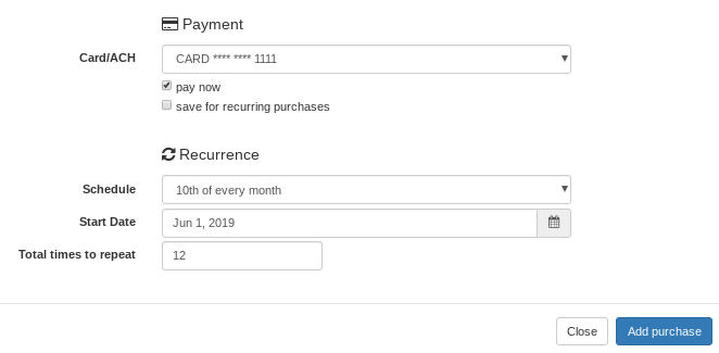Then under Recurrence, we optionally can select a schedule of recurrence, and then number of times we want the payment to repeat. It will then automatically add the Items from the Package to the account every month, and charge the card. In this example, 5 privates and 5 groups are added.