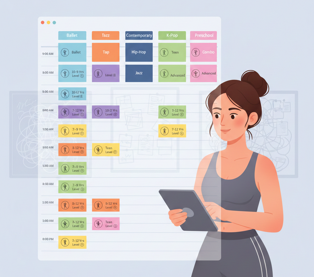 Studios offering ballet, tap, jazz, hip-hop, contemporary, K-Pop, combo classes, and preschool programs often juggle multiple rooms and overlapping schedules.